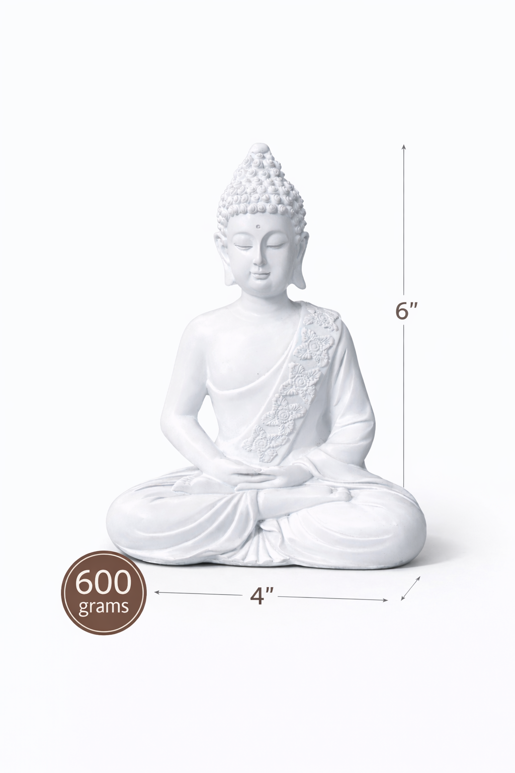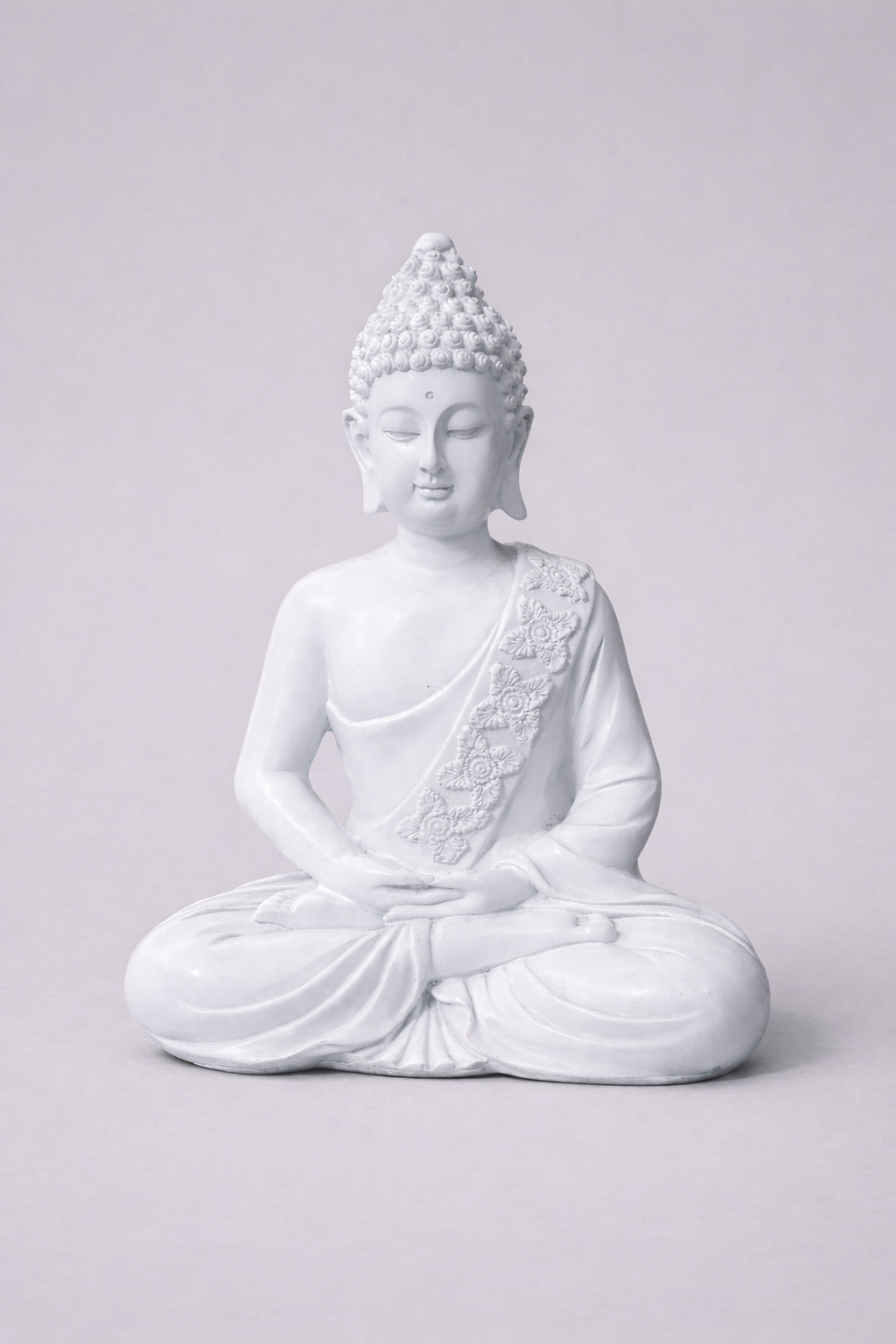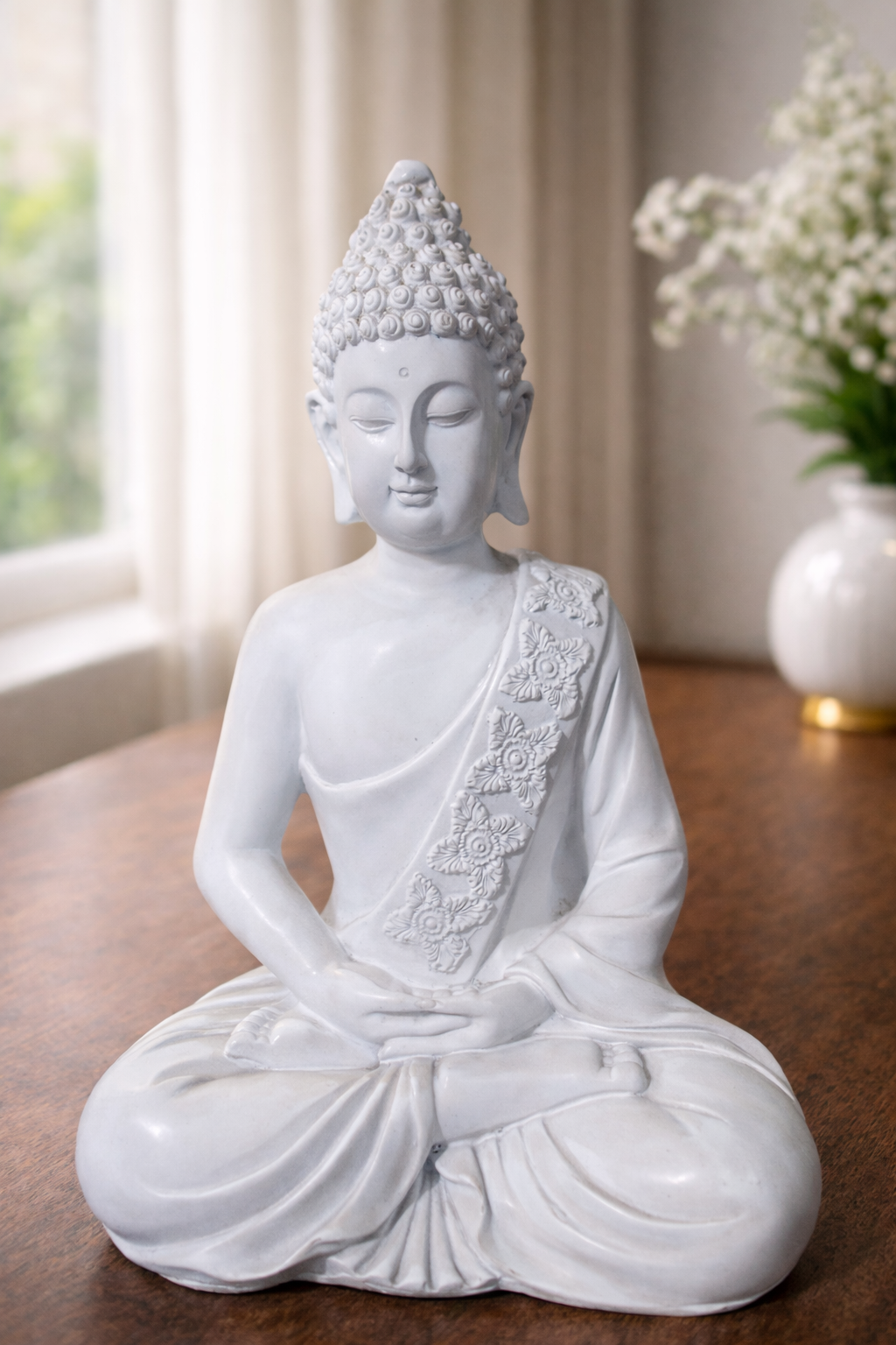 This Meditation Buddha Statue is made from durable resin that ensures long-lasting beauty and strength. The smooth white finish highlights intricate detailing on the robe and facial features, giving it a refined and artistic appearance.
