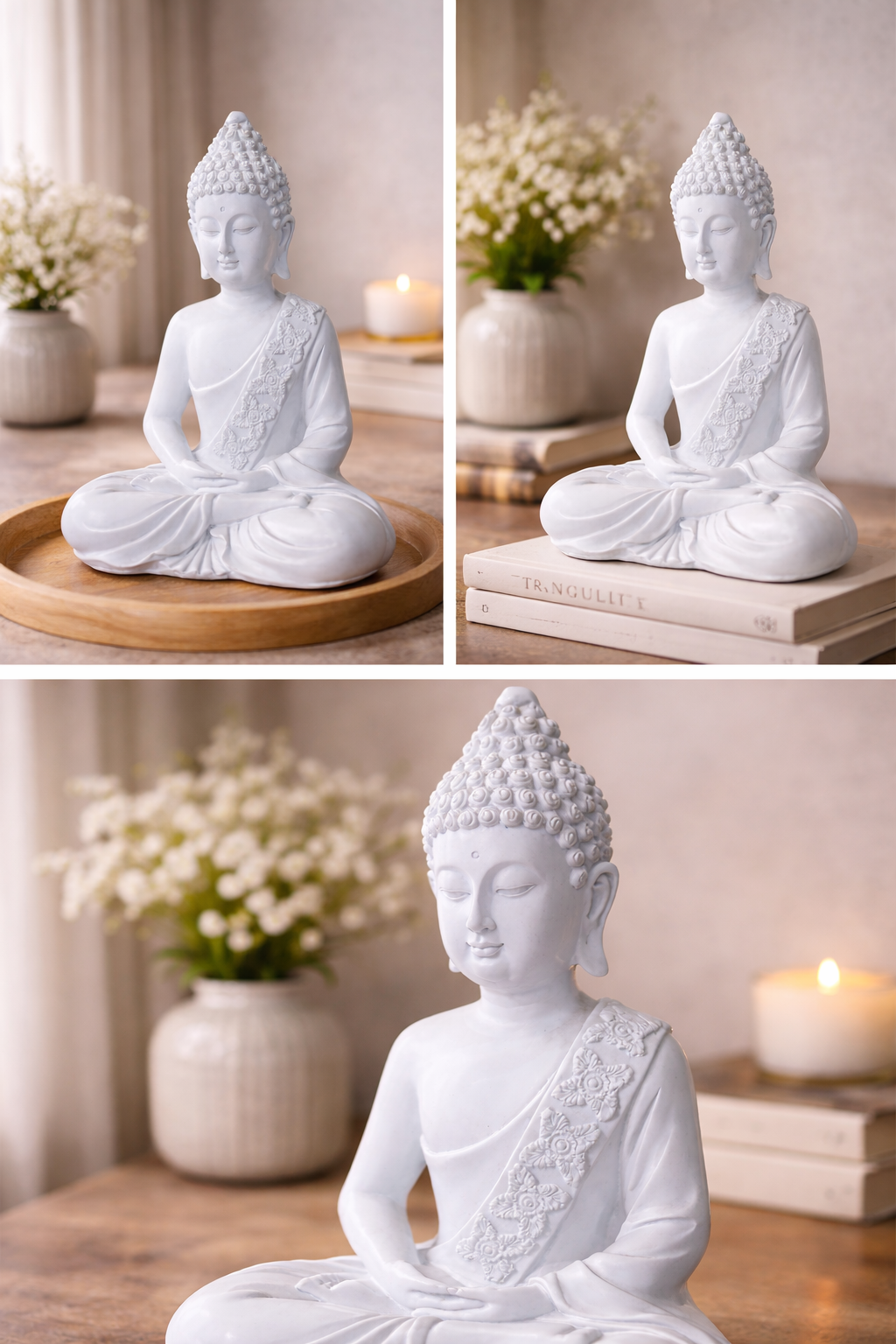 In Vastu and Feng Shui practices, a white Meditation Buddha Statue symbolizes purity, wisdom, and clarity of thought. When placed in living rooms, entryways, or study areas, it is said to attract positive vibrations and foster a sense of calmness and well-being. Whether used for spiritual practices or as a decorative centerpiece, this statue serves as a gentle reminder to stay grounded, peaceful, and mindful in everyday life.
